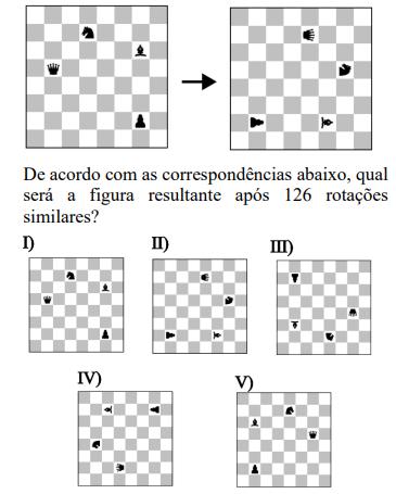 A figura abaixo mostra um tabuleiro de xadrez com algumas peças dispostas. Neste tabuleiro é feita uma rotação de 90° em sentido horário, sem mover relativamente as peças.