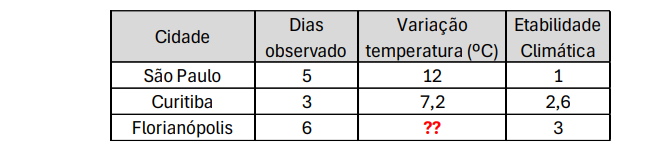 Considere que Florianópolis tem estabilidade climática 3, São Paulo tem estabilidade 1, e Curitiba tem estabilidade 2,6. Quanto maior o número de estabilidade, mais estável é o clima — ou seja, menos variação de temperatura. Resumindo, tem-se: